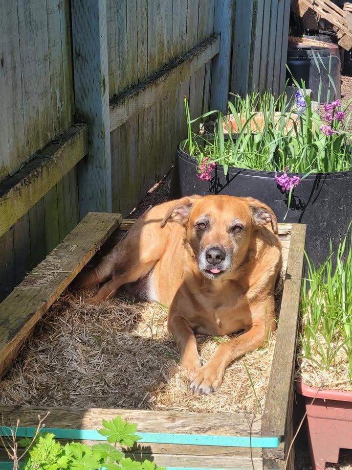 Dozer spent the Winter aerating and fertilizing the beds, and occasionally lying on them. It’s been a struggle to keep him out of the beds that he thinks are his responsibility, so we fenced them off with bamboo and string.