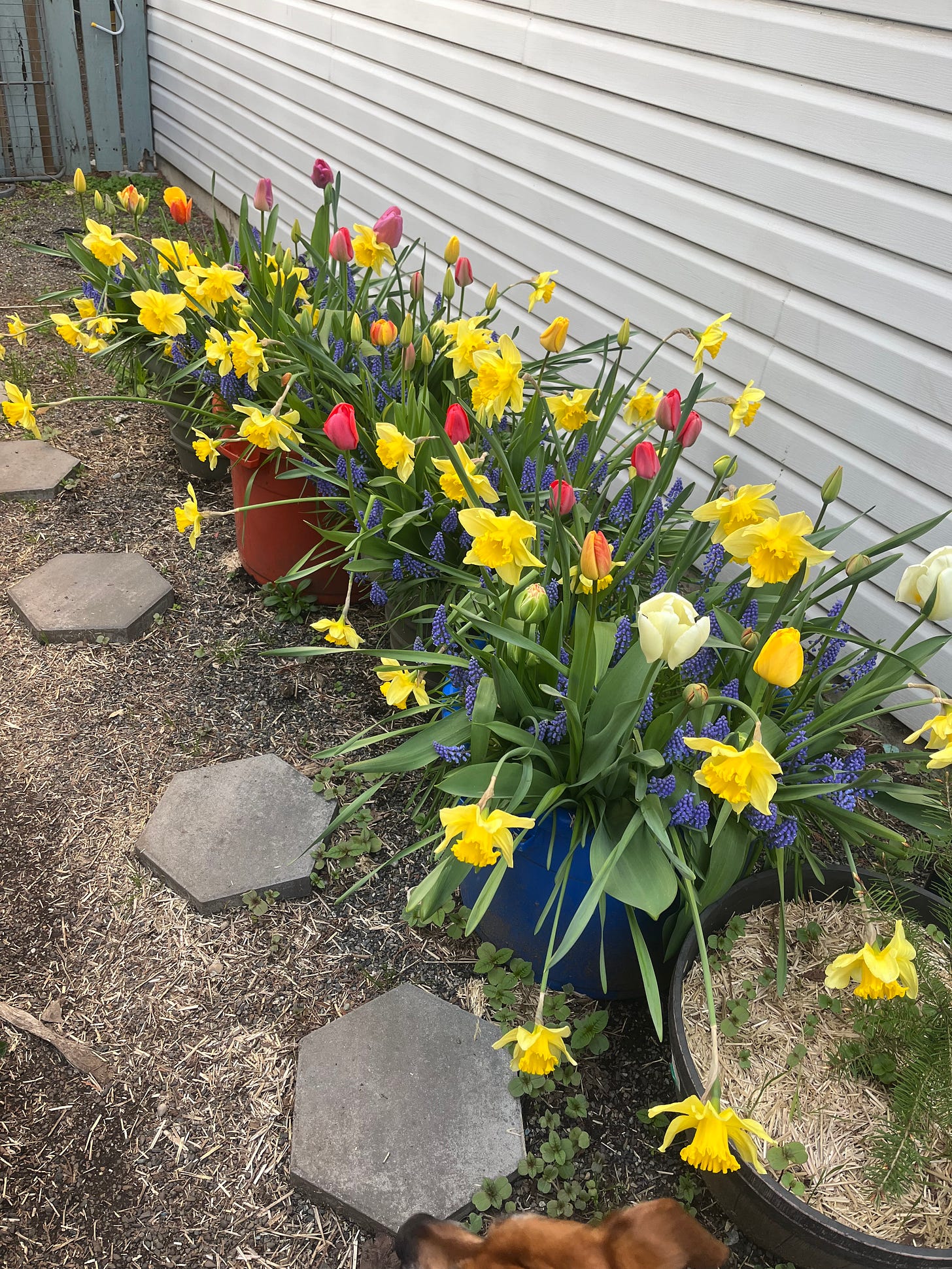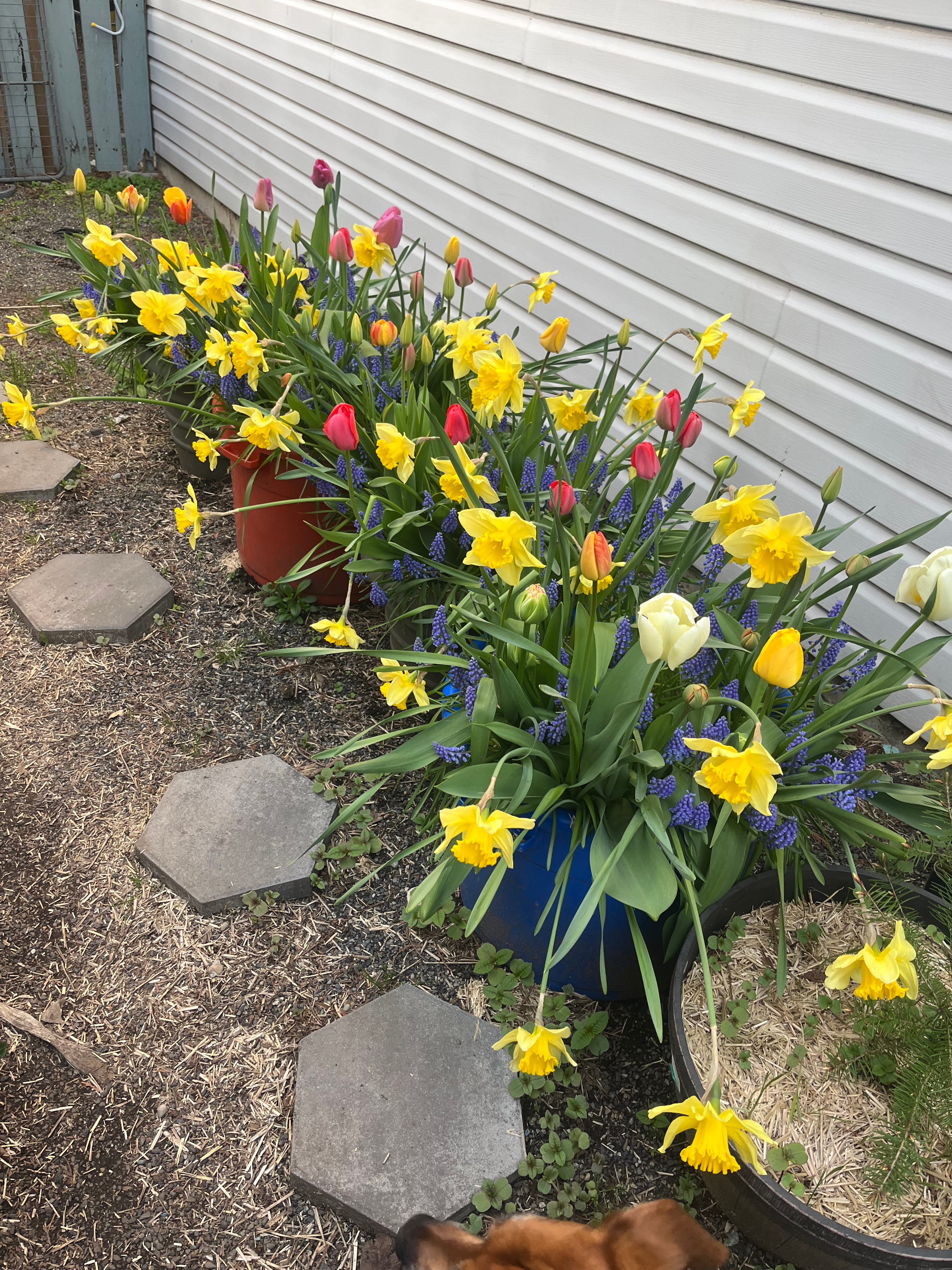 I was greeted with a homecoming of Hyacinths, Tulips, Daffodils, and Muscari that I had planted back in November of last year.